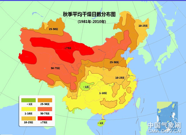 總體來看,秋季我國北幹南濕的分佈十分明顯。其中最乾燥的地區要數圖中大紅色的區域——北方西部地區和青藏高原,比如新疆的塔里木盆地、青海、甘肅、內蒙古以及西藏的部分地區,秋季乾燥日數達75天以上。