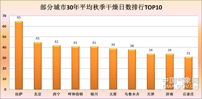 為了統計秋季的乾燥程度,我們把日最小相對濕度≤30%的情況,定義為一個乾燥日,也就是空氣中水汽含量相對較少的日子。