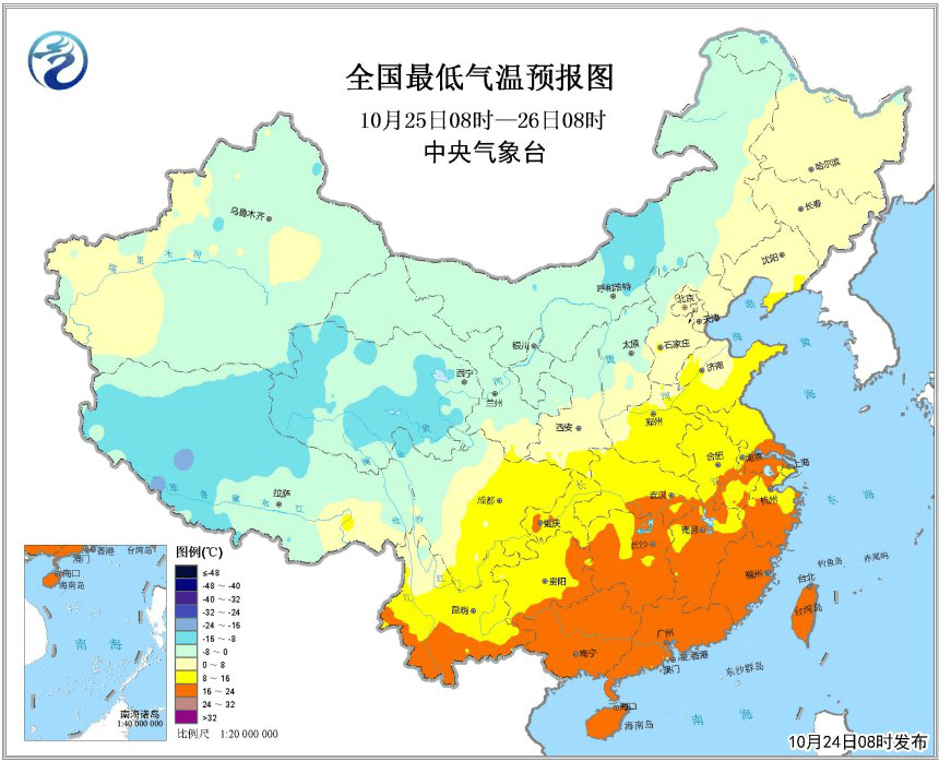 如圖藍綠色區域最低氣温都已步入零下。圖片來源:中央氣象台