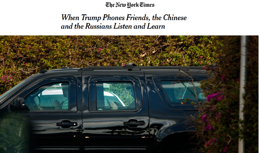 《紐約時報》這篇題為“特朗普給朋友打電話時,中國和俄羅斯人會竊聽學習”的文章煞有其事地説,美國情報報告顯示,當特朗普給他的老朋友打電話八卦、抱怨或徵求意見時,中國間諜往往都在竊聽,以便了解如何更好地影響特朗普以及美國政府政策。