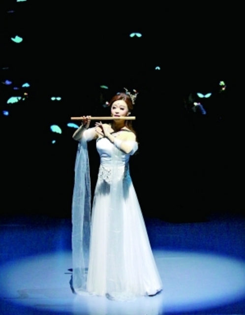 看《笛韻天籟》,與我們平時熟悉的舞台演出,無論是國粹的戲劇戲曲,還是外來的歌劇音樂劇,完全是不同的感受。演出的前半段,在講述笛子歷史的時候,充滿了原始的粗獷質樸,第一幕出現的是歷經實驗才製成的仿骨笛,這種比較純粹的原生態音樂,聽着不像我們日常接觸的音樂那樣賞心悦目,而是充滿了一種來自遠古的震撼和刺激,好像是在提醒聽者,回到那個蒼茫荒涼充滿危機的生存環境中,需要分泌出更多的腎上腺素。而當演出進入第二幕,由著名演奏家唐俊喬扮演的樂神出現以後,風格形成了轉折,骨笛的粗獷嘲哳與竹笛的清麗明亮形成了鮮明的對照。再到第三幕,笛子與崑曲相遇之後,原始的樂器形成了華麗的轉身,步入藝術的高雅殿堂。如果説我們平時看舞台演出,在隨着台上故事的發展喜怒哀樂的同時,欣賞表演者帶來的各種藝術技巧的話,那麼看《笛韻天籟》,就是要從神秘的笛子樂曲中探究出一種深刻的文化密碼,這種在視聽的模糊性感知與思考的精確性邏輯之間的不斷轉換過程,是一種全新的欣賞感受。