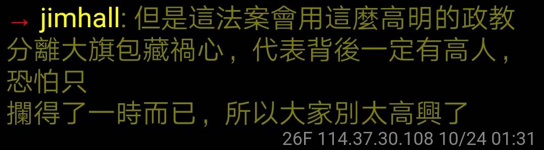 “但是這法案會用這麼高明的政教分離大旗包藏禍心,代表背後一定有高人。恐怕只攔得了一時而已,所以大家別太高興了。”