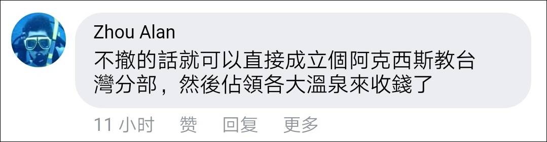 “不撤的話就可以直接成立個阿克西斯教台灣分部,然後佔領各大温泉來收錢了。”