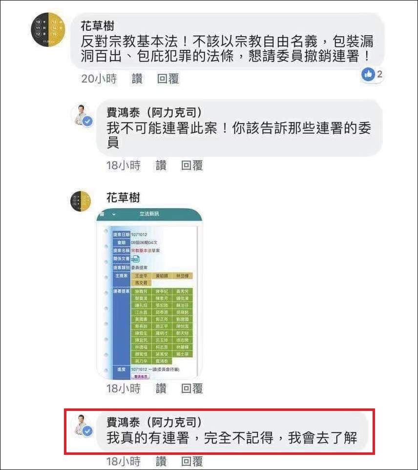 更讓人哭笑不得的是,在多個“立委”相繼撤籤後,有網友跑到國民黨“立委”費鴻泰的臉書下要求他也撤銷連署,結果費鴻泰先一臉嚴肅地説,自己不可能連署這個法案。在網友曬出證據後,費鴻泰也怔住了:“我真的有連署,完全不記得,我會去了解”。
