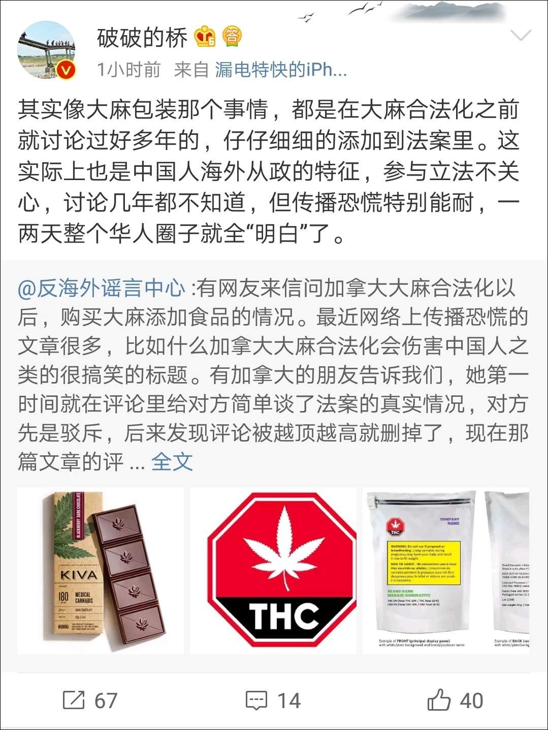 根據議院通過的“大麻法案”(Cannabis Act/Bill C-45)。加拿大大麻自10月17日合法化,距今只有1周。試想一下,如果這樣子就能讓中國人“很容易不知情地買到大麻食品”,那美國有9個州非醫用大麻合法,比如麻省、加州,合法化已經幾年了。你聽説過有中國人在那裏“不知情”地買到大麻食品嗎?