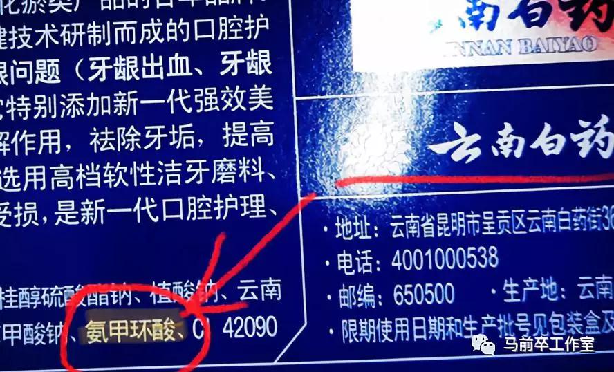 先是微頭條用户“科普醫生博雅”發文稱,去超市買牙膏,偶然發現雲南白藥等中草藥牙膏的成分表中含有“氨甲環酸”,該藥是血液科的常用止血藥,也是處方藥。