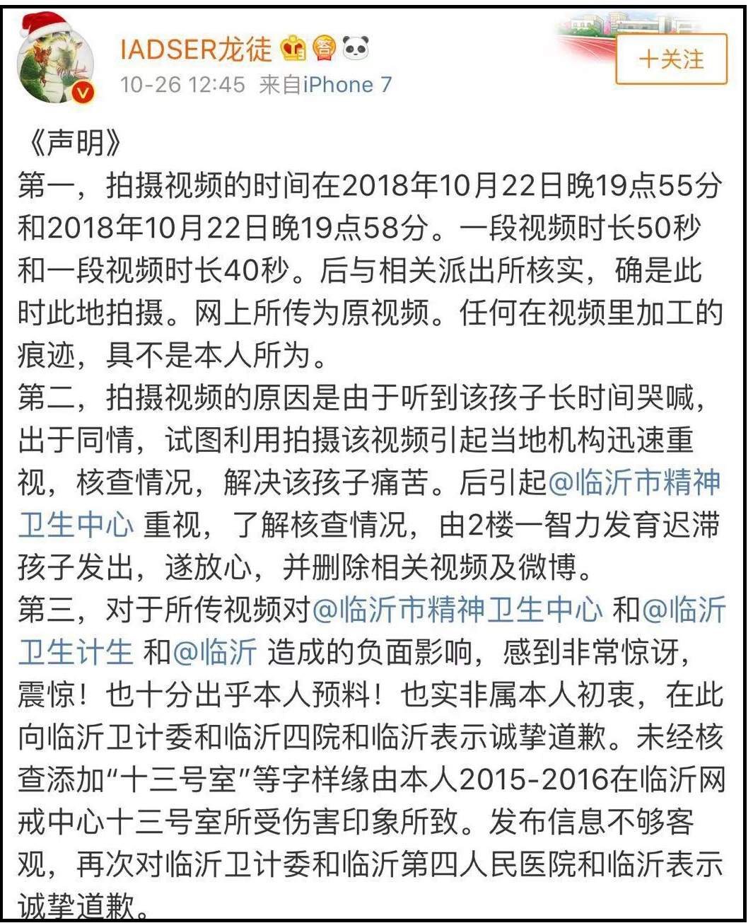 第三,對於所傳視頻對@臨沂市精神衞生中心 和@臨沂衞生計生 和@臨沂 造成的負面影響,感到非常驚訝,震驚!也十分出乎本人預料!也實非屬本人初衷,在此向臨沂衞計委和臨沂四院和臨沂表示誠摯道歉。未經核查添加“十三號室”等字樣緣由本人2015-2016在臨沂網戒中心十三號室所受傷害印象所致。發佈信息不夠客觀,再次對臨沂衞計委和臨沂第四人民醫院和臨沂表示誠摯道歉。