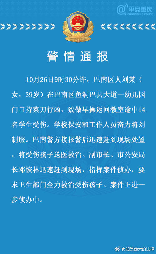 據重慶警方通報,10月26日9時30分許,39歲巴南區人劉某在巴南區魚洞巴縣大道一幼兒園門口持菜刀行兇,致做早操返回教室途中14名學生受傷。學校保安和工作人員奮力將嫌疑人制服,將受傷兒童送醫救治。