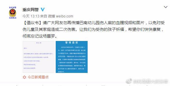 同時,@重慶網警 呼籲:請廣大網友勿再傳播案件血腥視頻和圖片,以免對受傷兒童及其家庭造成“二次傷害”。讓我們為受傷的孩子祈福,希望你們快快康復,徹底忘記這場噩夢。