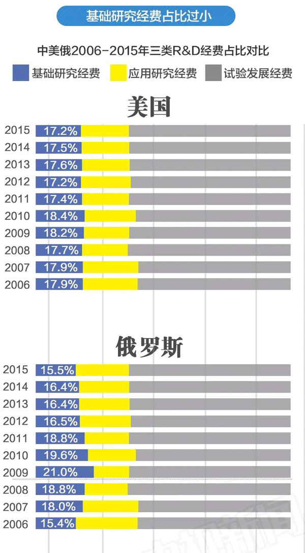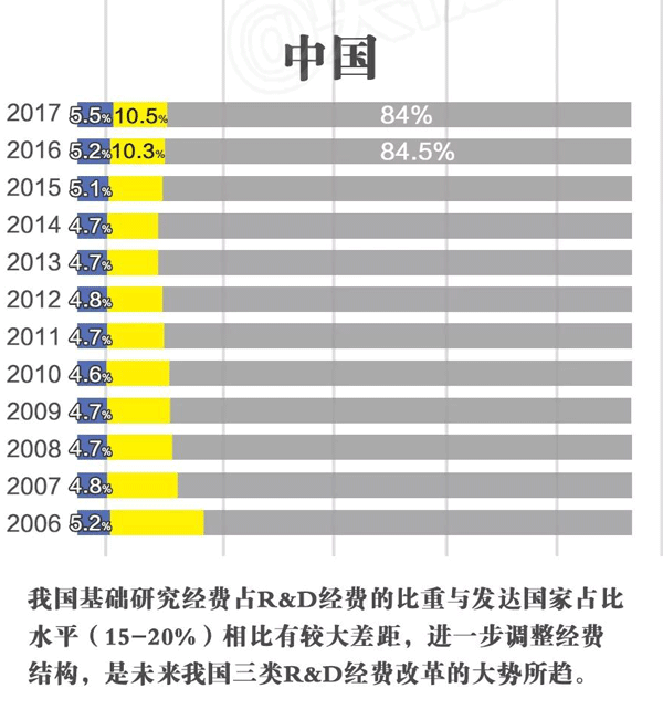 實際上研發投入中,中國的基礎研究經費整體上一直是比重太低,恰恰是因為我們太注重“應用”,太注重“突破後能帶來哪些影響”這種馬化騰式的問題了。