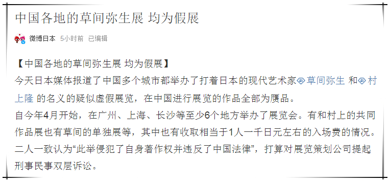 今天日本媒體報道了中國多個城市都舉辦了打着日本的現代藝術家草間彌生和村上隆的名義的疑似虛假展覽,在中國進行展覽的作品全部為贗品。自今年4月開始,在廣州、上海、長沙等至少6個地方舉辦了展覽會。有和村上的共同作品展也有草間的單獨展等,其中也有收取相當於1人一千日元左右的入場費的情況。二人一致認為“此舉侵犯了自身著作權並違反了中國法律”,打算對展覽策劃公司提起刑事民事雙層訴訟。