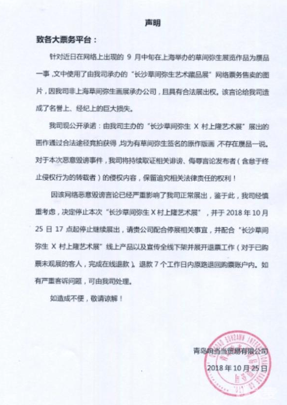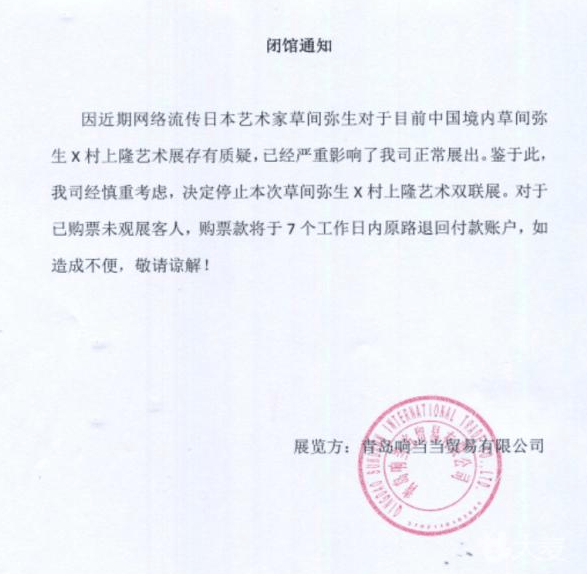 因近期網絡流傳日本藝術家草間彌生對於中國境內草間彌生x村上隆藝術展存有質疑,已經嚴重影響了我司正常展出。鑑於此,我司經慎重考慮,決定停止本次草間彌生x村上隆藝術雙聯展。
