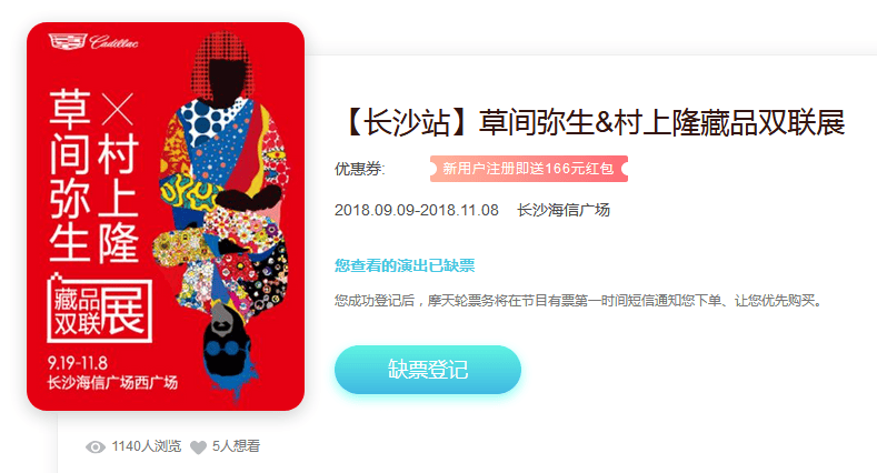 在網上搜索之後,長沙的《草間彌生&村上隆藏品雙聯展》原定是會開放到11月8日,但現在購票網站上顯示缺票,不知道是不是展覽方已經停止了展覽。