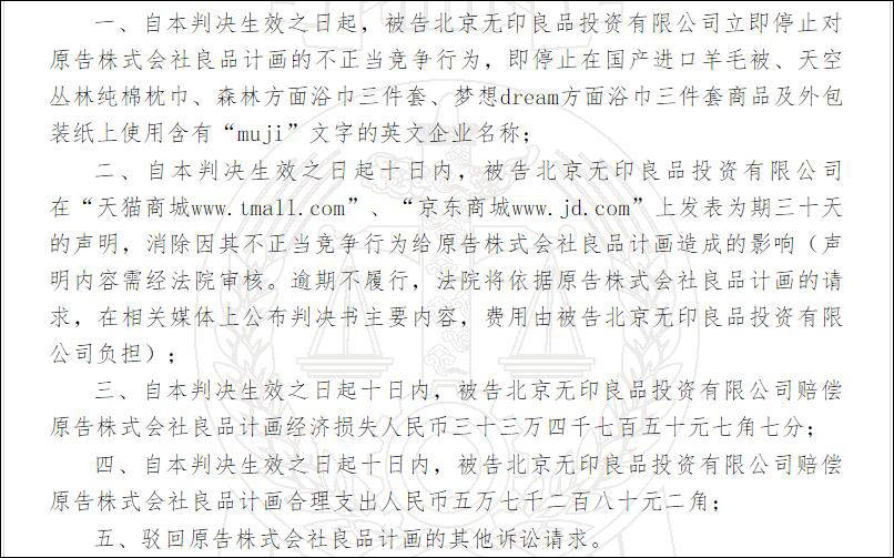 一、自本判決生效之日起,被告北京無印良品投資有限公司立即停止對原告株式會社良品計畫的不正當競爭行為,即停止在國產進口羊毛被、天空叢林純棉枕巾、森林方面浴巾三件套、夢想dream方面浴巾三件套商品及外包裝紙上使用含有“muji”文字的英文企業名稱;