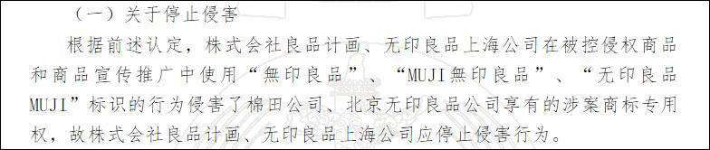 根據前述認定,株式會社良品計畫、無印良品上海公司在被控侵權商品和商品宣傳推廣中使用“無印良品”、“MUJI無印良品”、“無印良品MUJI”標識的行為侵害了棉田公司、北京無印良品公司享有的涉案商標專用權,故株式會社良品計畫、無印良品上海公司應停止侵害行為。