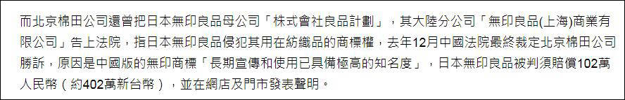 台媒説,北京棉田公司早些時候把日本無印良品母公司“株式會社良品計劃”的大陸分公司“無印良品(上海)商業有限公司”告上了法庭,指責日本無印良品侵犯其用在紡織品的商標權。2017年12月,法院最終判定北京棉田公司勝訴,原因是中國版的無印商標“長期宣傳和使用已具備極高的知名度”。最終日本無印良品被判須賠償102萬人民幣並在網店及門市發表聲明。