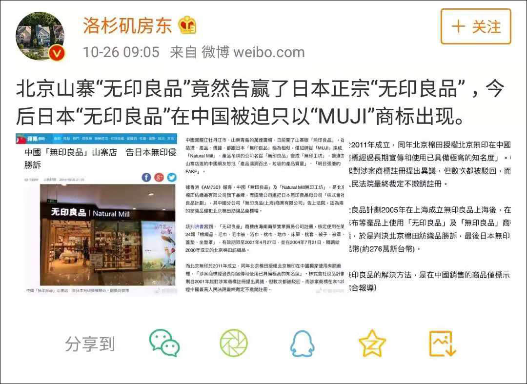今天刷微博,看到一個令人十分震驚的消息,這位博主説北京山寨“無印良品”告贏了日本正宗“無印良品”,並且日本“無印良品”以後在中國只能被迫以“MUJI”商標的形式出現了。