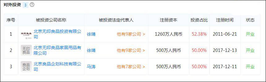 通過查詢公開信息可以發現,北京棉田紡織品有限公司成立於1998年,是一家主要做紡織業的企業。該公司對外投資一共有三筆,全都與“無印良品”有關。