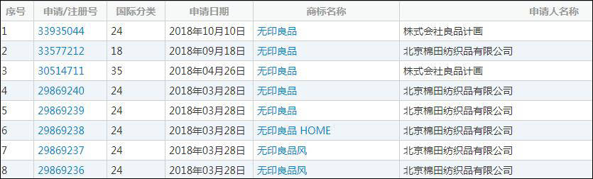 為了求證事情的真實性,我特意去查證了一番。通過工商總局的商標查詢系統查詢“無印良品”關鍵字,可以看到有一家名叫“北京棉田紡織品有限公司”的註冊了很多無印良品的商標。