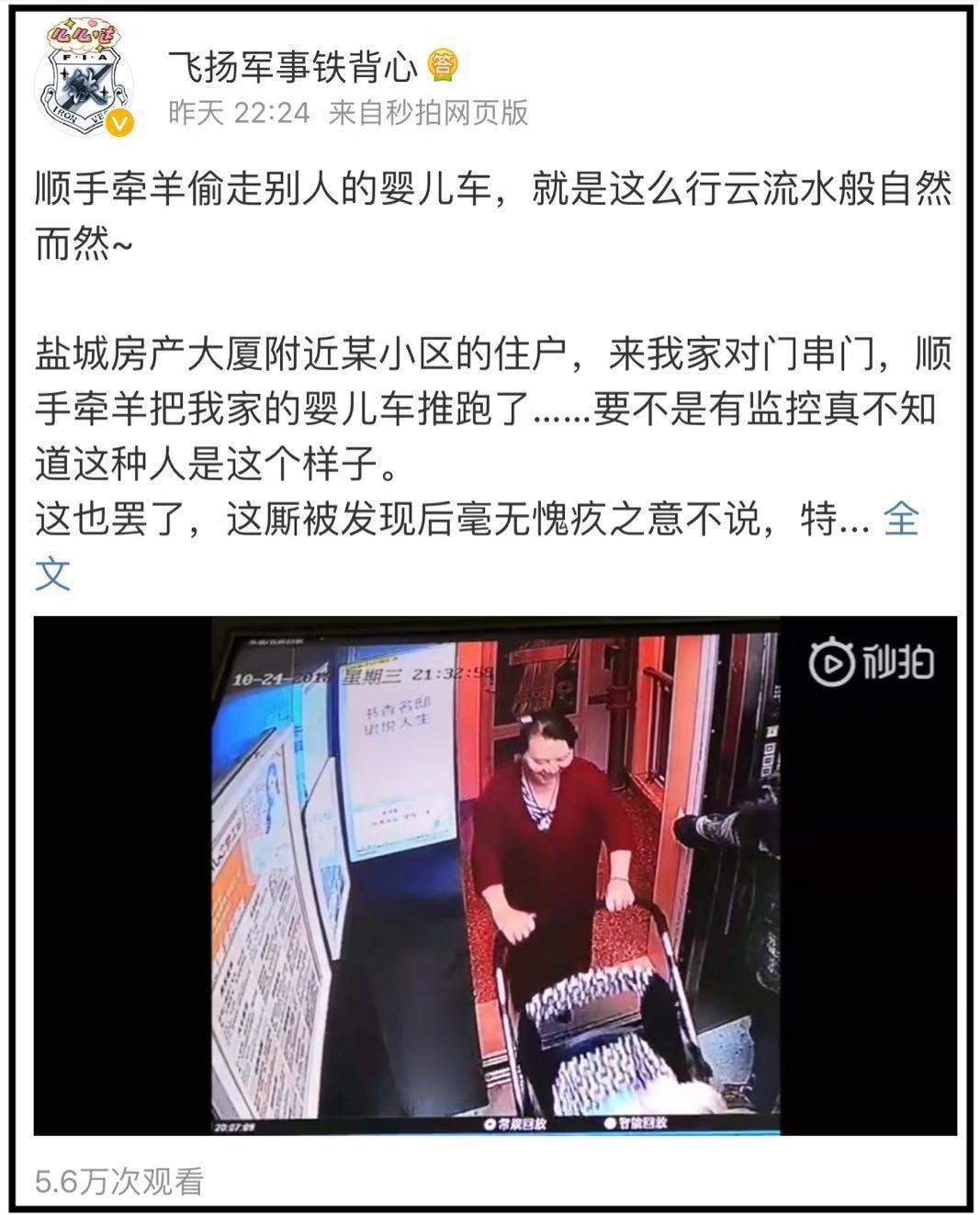 鹽城房產大廈附近某小區的住户,來我家對門串門,順手牽羊把我家的嬰兒車推跑了……要不是有監控真不知道這種人是這個樣子。