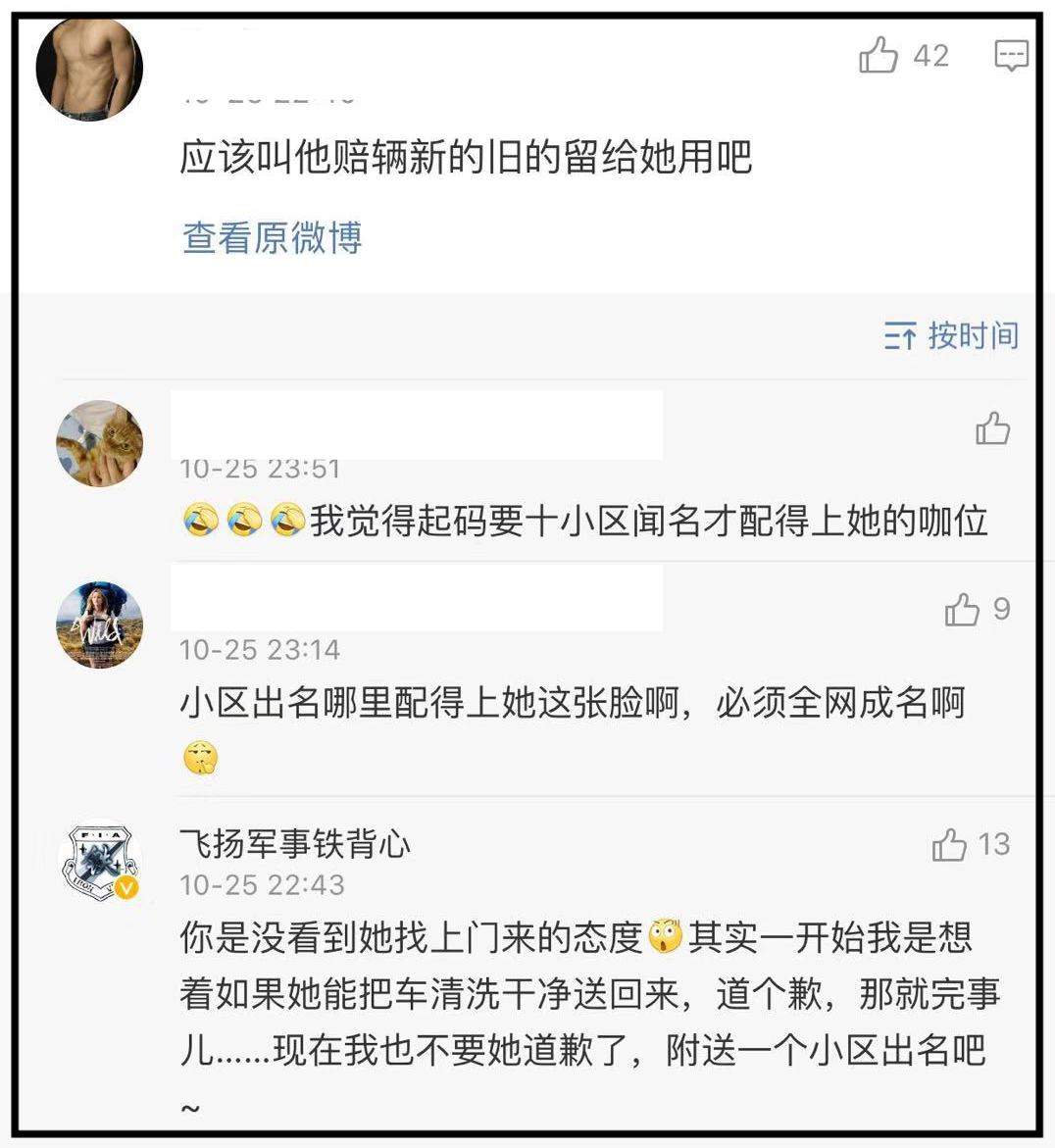 但博主表示:“你是沒看到她找上門來的態度。其實一開始我是想着如果她能把車清洗乾淨送回來,道個歉,那就完事兒…..現在我也不要她道歉了,附送一個小區出名吧。”