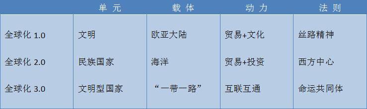 如果我們把作為古代東西方貿易與文明交流之路的絲綢之路稱之為全球化1.0時代:其單元是文明,載體是歐亞大陸,動力是貿易-文化,遵循的“和平合作、開放包容、互學互鑑、互利共贏”絲路精神;近代西方開創的全球化稱之為全球化2.0時代:以民族國家為單元,通過海洋實現全球貿易-投資擴張,確立西方中心世界;那麼,“一帶一路”是21世紀的跨洲際合作倡議,不只是打通曆史上中斷的絲綢之路,而是藉助絲綢之路的歷史概念,開創新型全球化——全球化3.0時代:秉承“萬物互聯”,運用3D打印機、大數據和智慧城市,推動E-WTP進程,開發和應用包容性技術——改變傳統技術讓強者更強、弱者更弱的狀態,創新和實施包容性制度安排——推動國際貿易、投資規則更加公正、合理、包容,開創包容性全球化——實現持久和平、共同繁榮的千年夢想。