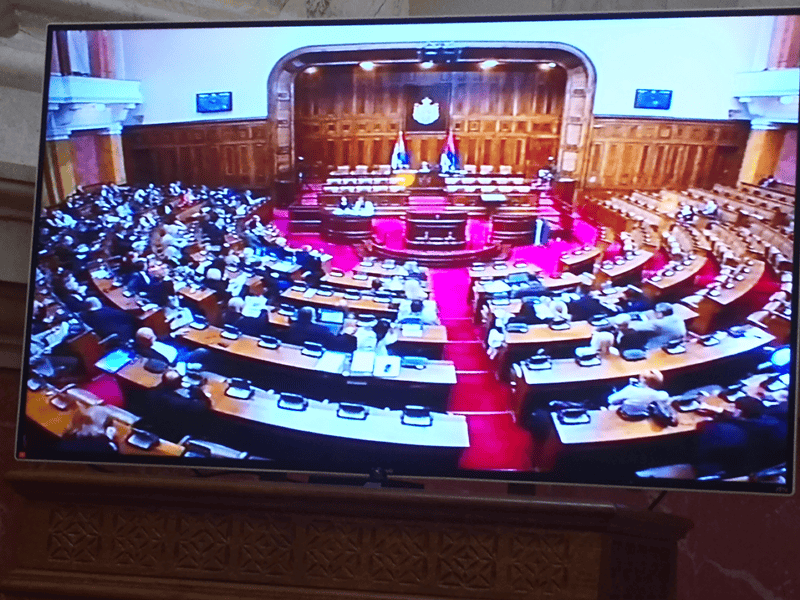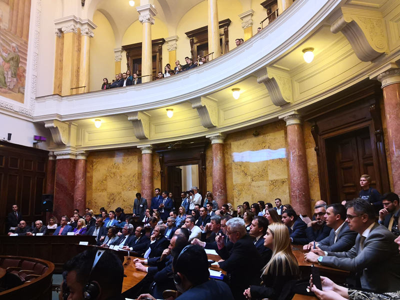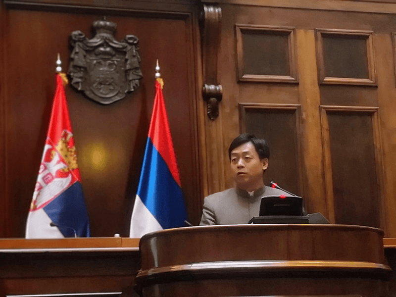 帶着昨晚的喜悦和興奮,今天在塞爾維亞國會發表演講,站在塞爾維亞國旗面前,我感到十分激動——在給台下嘉賓鞠躬後情不自禁地向塞國旗鞠躬,向英勇不屈的塞爾維亞人民致敬,向鮮血凝成的中塞友誼致敬(掌聲)。