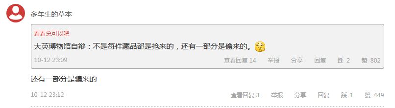 倒是想起了前些日子大英博物館還大言不慚地説:不是每件藏品都是搶來的。