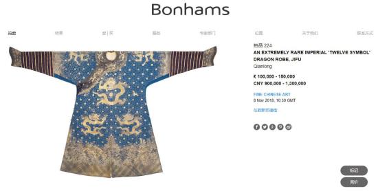 這件龍袍由英國私人拍賣所邦瀚斯(Bonhams)拍賣,預估價為90萬~130萬。其中國藝術部專家馬蒂諾博士認為,這件龍袍是為乾隆皇帝量身定做,之後又被後來繼位的皇帝使用。這件龍袍長年被掛在蕭爾一家的牆上,可能考慮到絲綢不易保存而打算賣出。