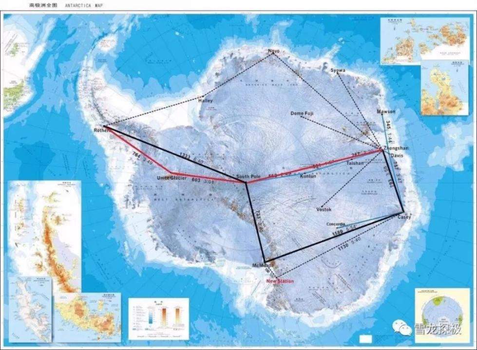 上圖中標記的紅色線是飛機轉場到達中山站的路線,從南極半島區域的羅斯拉站(英國)進入南極,由羅斯拉站到聯合冰川機場(屬於NGO非政府組織的機場),然後轉場到南極點,最後轉至中山站。