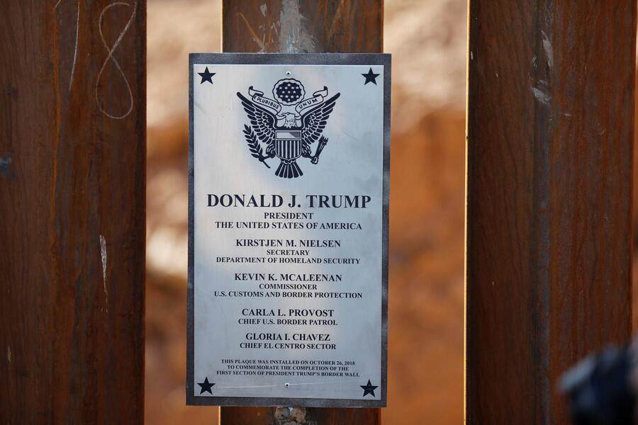 上週五,這面“邊境牆”上還被掛起了一塊牌匾,上面寫着“紀念特朗普總統邊境牆的第一部分完工”。