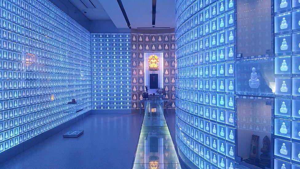 同樣是死亡,無人送終的日本老人看好了一個商場底樓的高科技墓地,決定在死後將自己的骨灰放置在這裏閃耀的霓虹牌照後面,以便每天都有僧人為自己祈禱唸經。看守的僧人説:“我們不應該忘記自己作為寺廟的角色,就是在變化的時代中滿足人們的需求。”