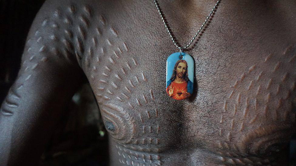與之相比,巴布新幾內亞 Kaningara 年輕人的成年禮更挑戰。他們需要在身上切割出成百上千條傷口並通過特殊方法讓傷口結痂留住形狀,以象徵自己獲得了鱷魚的精神和勇氣。這樣的紋身將跟隨他們終身,而如今,這樣的傳統又和基督教信仰融合到了一起。