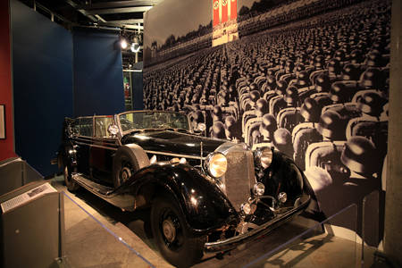 在二戰館裏,希特勒的“大奔馳”敞篷車在這裏。卡爾·奔馳發明了汽車,奔馳是最老的汽車品牌,也是最尊貴的德國品牌,如果不算短命的邁巴赫的話。在2016年寶馬慶祝100週年的時候,奔馳發來調侃賀電:“感謝100年的競爭,此前30年有點乏味”,暗指奔馳歷史比寶馬早30年。奔馳博物館還對寶馬僱員免費開放一個星期,鼓勵他們“發現完整的汽車歷史”。納粹對代表“德國優越”的奔馳情有獨鍾,希特勒總是站在敞篷的奔馳車上檢閲,尤其是號稱“大奔馳”的奔馳770K。這輛超級豪華轎車的公司代號為W150,是當年最昂貴的,用户除了希特勒、戈林外,還有芬蘭的曼納海姆、挪威的吉斯林、日本的裕仁天皇、葡萄牙的薩拉扎爾、西班牙的佛朗哥等,還有一輛專門為入侵英國成功的話送給親納粹的愛德華八世而準備的。這車即使在當年也是有市無價,“有意者請查詢”。W150共生產了88輛,生產一直持續到1943年。這輛是美軍官兵在被佔領的德國發現的,被作為戰利品運回美國後,賣給一個加拿大有錢人,後者捐獻給戰爭博物館了。原以為這是戈林的車,後來考證下來,這是希特勒的車。車況依然良好,凸現奔馳的做工精細。有幾塊玻璃碎裂了,特意沒有修復,保存歷史感。
