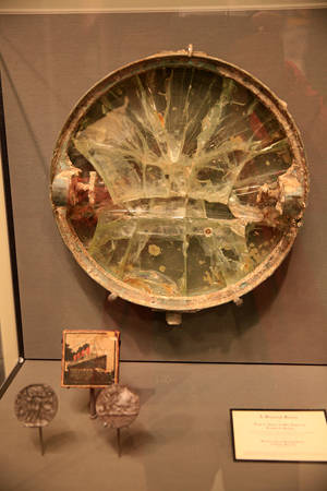 在一戰館裏,有一個“露西塔尼亞”號的舷窗。“露西塔尼亞”號是英國庫納德輪船公司的跨大西洋豪華郵輪,庫納德的其他有名的郵輪包括二戰時代的“瑪麗女王”號、“伊麗莎白女王”號和70-80年代的“伊麗莎白二世”號。“露西塔尼亞”號和姐妹船“毛里塔尼亞”號則是一戰時代的名船,前者曾獲得橫跨大西洋最快速度的“藍帶獎”。1915年5月7日,德國潛艇U-20號用魚雷擊沉了“露西塔尼亞”號,1198人喪生,其中包括128名美國人,這是美國公眾打破孤立主義情節的轉折點,最終導致美國對德宣戰。當時郵輪是大西洋上的主要交通方式,常有有錢旅客攜帶貴重物品,比如據報道旅客之一休·萊恩爵士在鉛製圓桶裏裝有倫勃朗、魯本斯和莫奈的名畫。戰後有過多次打撈行動,這個舷窗是其中一次打撈上來的,鏽跡斑斑的鋼鐵框子和破碎的玻璃訴説着久遠的故事。