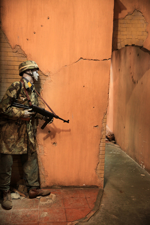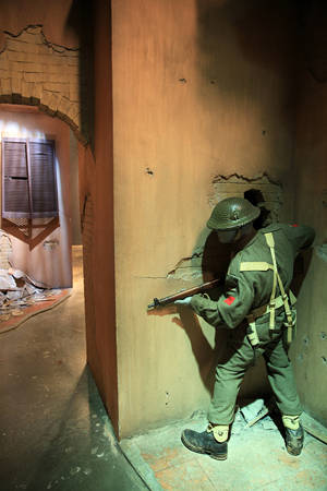 有意思的是,幾乎所有軍博都把槍炮收藏起來,槍統統放進玻璃櫥裏,炮攔在繩索後面。但在這裏,有些槍是直接固定在牆上的,儘管碰,儘管摸,當然什麼都鎖死了,也不可能拿下來。有一支AK47用鐵環套住,可以端起來比試,但拿不出來。手榴彈、刺刀(當然沒有刀口了)、手槍,都這樣,可以直接觸碰。還有一個巷戰模型,反映在荷蘭小鎮的巷戰情景。真人大小的德軍士兵手拿MP38衝鋒槍躲在門邊牆後,另一邊是同樣真人大小的加拿大士兵手拿李·恩菲爾德步槍,兩人都在牆後耐心地等着對方犯錯誤,現場感特別強。這裏,遊人可以走上前去,零距離站立在模型士兵身邊,手裏的衝鋒槍和所有佩件同樣是可以觸摸的。