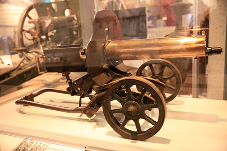 這裏還有一挺金光閃閃的馬克沁重機槍。這是德軍在東線從俄軍繳獲的,然後在維米嶺被加拿大軍隊繳獲。馬克沁機槍改寫了戰爭規則,這是戰爭史上最重要的武器之一,從此單純用數量壓倒敵人的步兵或者騎兵集團衝鋒不再是陸軍的主要進攻手段,最終導致了坦克和裝甲突擊的出現。有意思的是,馬克沁機槍在交戰雙方都是主力重機槍,在英國稱為維克斯機槍,在德國稱為MG08,在美國稱為M1904,在沙俄稱為PM1910,意為馬克沁機槍1910型,這才是最正宗的叫法,因為這是美國出生、移居英國的希拉姆·馬克沁發明的。馬克沁機槍的外觀很有特徵,粗壯的的散熱護套像圓筒子一樣。這挺馬克沁機槍用散熱更好的銅皮作護套,所以看起來金光閃閃。