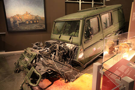 朝鮮戰爭館裏有志願軍和人民軍的模型和武器,並不青面獠牙,也沒有倫敦的帝國戰爭博物館裏中國軍人同時戴着八路軍胸標和紅領章、紅五星的笑話。維和館裏有大狙、火箭筒等,還有一輛發動機艙被炸透的奔馳G級越野車,這相當於加拿大軍隊使用的簡版悍馬,還好裝甲保護了乘員,都活着回來了。現代館裏基本上都是常見的大路貨,包括各型突擊步槍、輕重機槍、火箭筒、反坦克導彈等,還有英制“酋長”式和俄製T-72坦克。現代主戰坦克明顯比二戰坦克大多了。