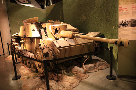 展廳的另一角,有一輛德國的III號自行反坦克炮,這是加拿大軍隊在意大利北部突破歌德防線的戰鬥中繳獲的。德國空軍元帥凱塞林受命在這裏組織防線,頂住盟軍向德國的進攻。希特勒擔心防線最後會守不住,歌德的名字被盟軍用於宣傳,命令凱塞林改名為“綠色防線”。凱塞林打得很出色,在優勢敵人面前,始終敗而不潰,直到盟軍發動最後總攻才終於頂不住了。這輛III號反坦克炮真真是被打成零件狀態了,一定見證了特別慘烈的戰鬥。