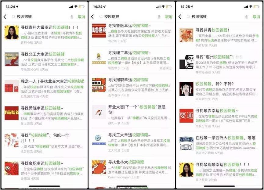 近日,微信公眾號“華科校友圈”發佈消息:“尋找華科錦鯉之王:1萬元現金、戴森捲髮棒,還有男女朋友,統統送給你!”微信公眾號“武大校友圈”發佈消息:“尋找武大錦鯉一枚,12500元現金、iPhone XS 256G、男/女朋友,統統送給你!”隨後,微信公眾號“華師校友圈”也發佈消息:“尋找華師錦鯉一枚,SONY相機、GUCCI包包……統統送給你……”
