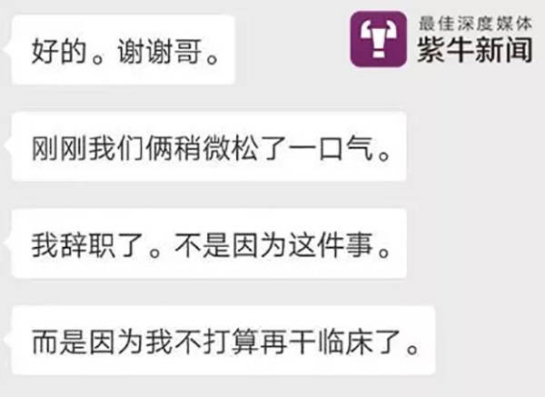 至於博雅辭職的原因,譚秦東稱,最主要是因為她對工作感到了厭倦。博雅在微信中跟譚秦東説,辭職“不是因為這樣事(雲南白藥牙膏事件),而是因為不打算再幹臨牀了”。