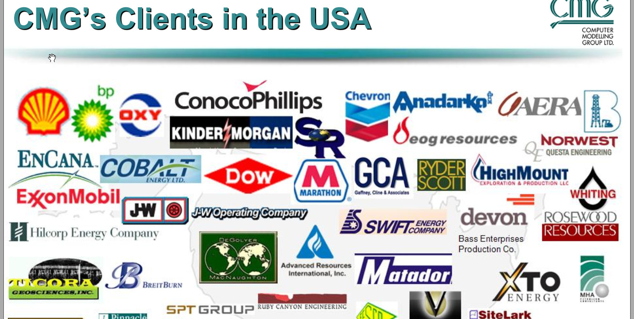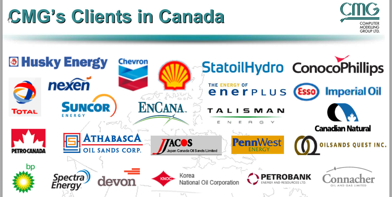 加拿大開發的石油工業軟件之一是CMG Suite,CMG公司位於加拿大艾伯塔省卡爾加里,是全球最大的油藏數值模擬軟件獨立開發商,CMG Suite是全球著名的油氣藏的建模與仿真軟件,該軟件在全球範圍內被認為行業標準。通過結合使用易於使用的模型構建工作流程,最先進的性能增強技術和跨學科多物理技術,模擬簡單到最先進的恢復流程(例如熱效應,地球化學,地質力學,流體和相行為),以準確模擬回收過程。包括模塊