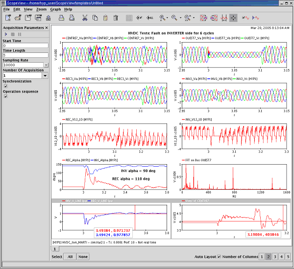 用户可以搭建電網模型,配置元件參數,添加測量點,MapTask自動任務分配,仿真開始與結束控制,在線調參等。HYPERSIM提供了精確的潮流分析模塊,根據功率/電壓基準值,建立起電力系統的穩態條件,自動初始化電力系統。先進的插值技術,使用户能夠精確仿真兩個時間步長之間出現的閥觸發。