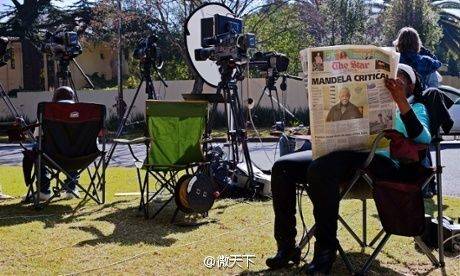 2013年12月5日,前南非總統曼德拉在醫院等待離世,場外同樣有大批記者等待。事實上,就在曼德拉還在世的最後一段時間,他家附近就有記者開始蹲點。