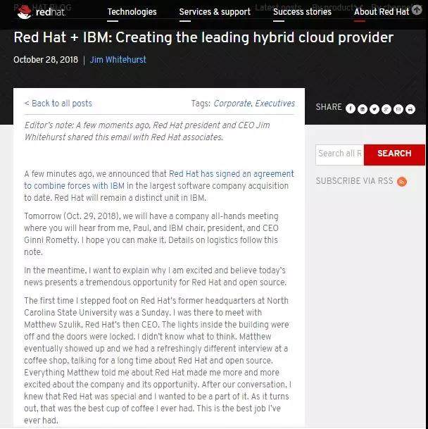 對於此次合併交易,Red Hat 官網發佈了一篇名為**《Red Hat + IBM: Creating the leading hybrid cloud provider》的博文**。