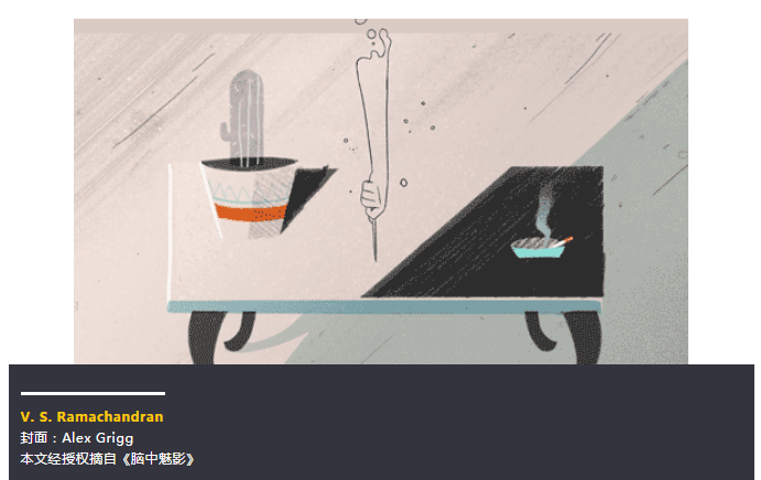 同一天下午我給他鏡子試試,他立刻就能張開他的幻手了。痙攣也沒有了,指甲深掐到手掌裏的這種感覺也消失了。如果您仔細想一下,這是一種令人困惑不解的現象。這裏講的是一個既沒有手,也沒有指甲的人。這個人怎麼會把並不存在的指甲掐進也不存在的手掌裏面去,還由此產生鑽心刺骨的疼痛呢?為什麼一面鏡子就能消除這種虛幻的痙攣呢?