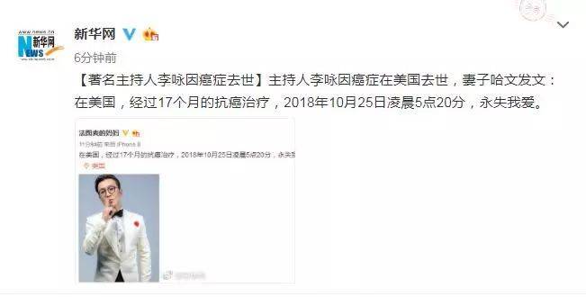 今天,最令人震驚的消息莫過於此。李詠去世!陪伴我們的可愛幽默的主持人走了!