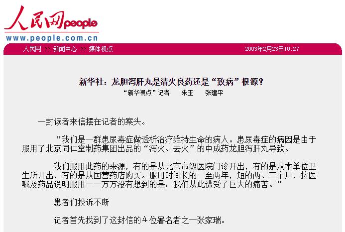 2002年,新華社以系列報道的形式披露某仁堂"龍膽瀉肝丸"造成尿毒症。