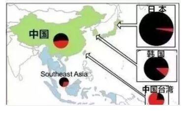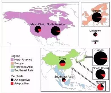 可以看出北美、日本服用過馬兜鈴酸的人羣比例很小,而台灣和大陸很多。