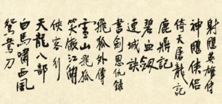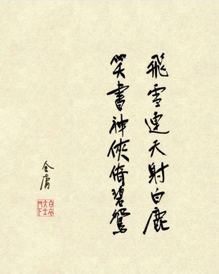 自他1955年開始寫作,到1972年封筆,一共出版了15部作品。金庸將除開《越女劍》外的14本書書名首字連成一副對聯,名為“飛雪連天射白鹿,笑書神俠倚碧鴛”,別有一番浪漫之感。
